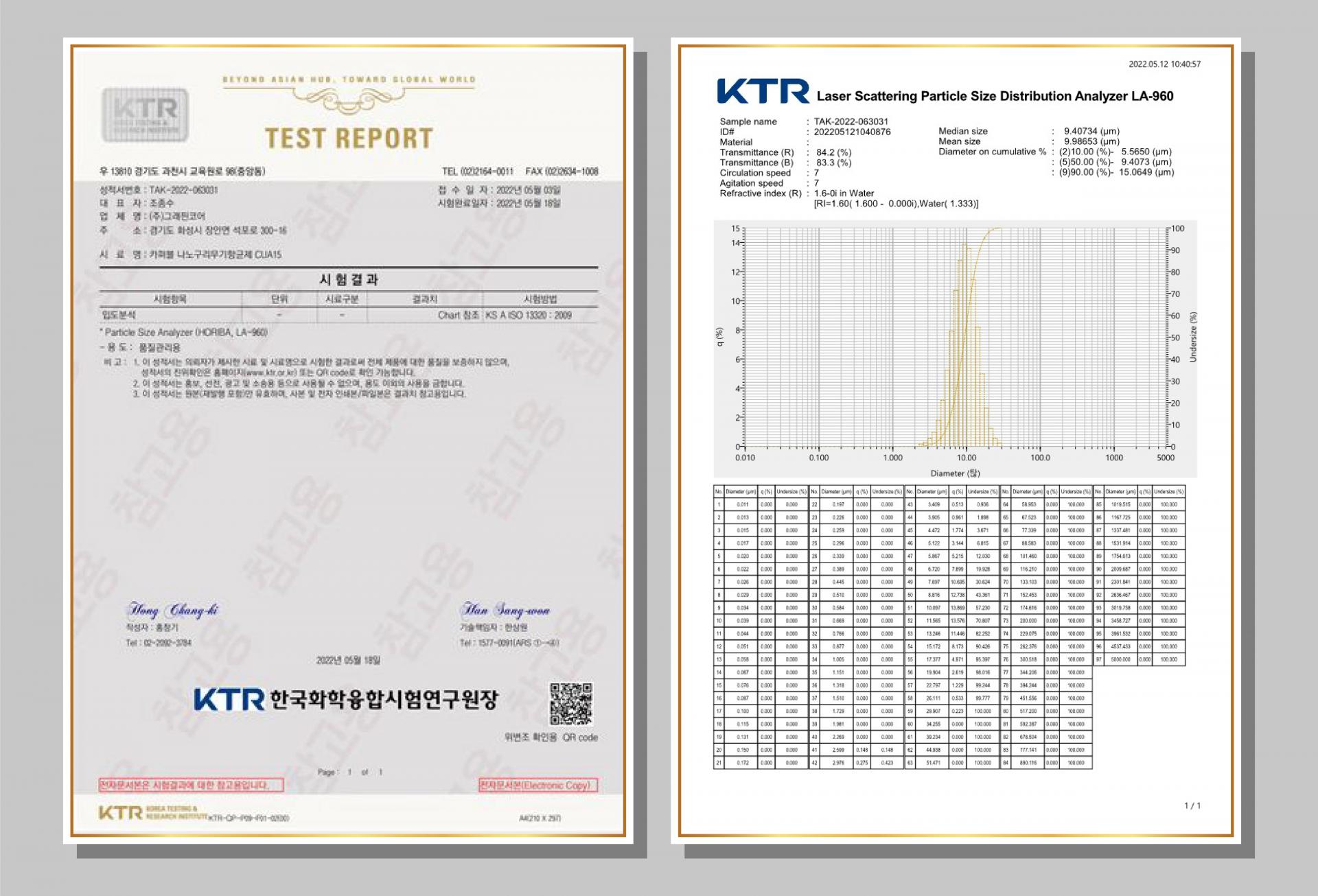 CUA15는 평균 입도 9~ 9.5 ㎛을 입증하였습니다.