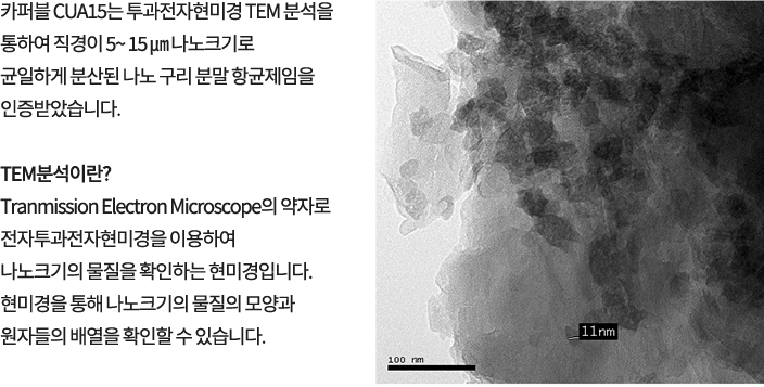 나노입자 크기를 측정한 결과 나노구리항균제 CUA15는 평균 입도 9~ 9.5 ㎛을 입증하였습니다.